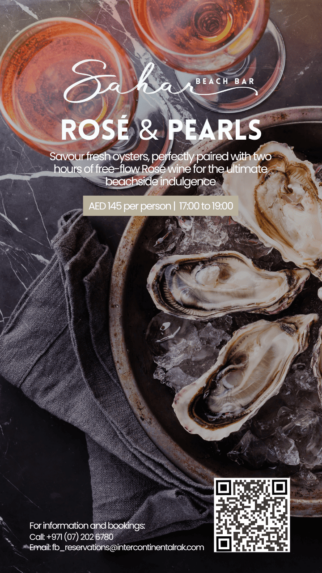 Treat yourself to six freshly shucked Dibba Bay oysters, paired to perfection with unlimited pours of selected rosé wine, as you soak in the coastal breeze and golden sunshine. Whether it’s a leisurely afternoon escape or a sunset celebration, this daily ritual invites you to savour the finer things in life by the shore.