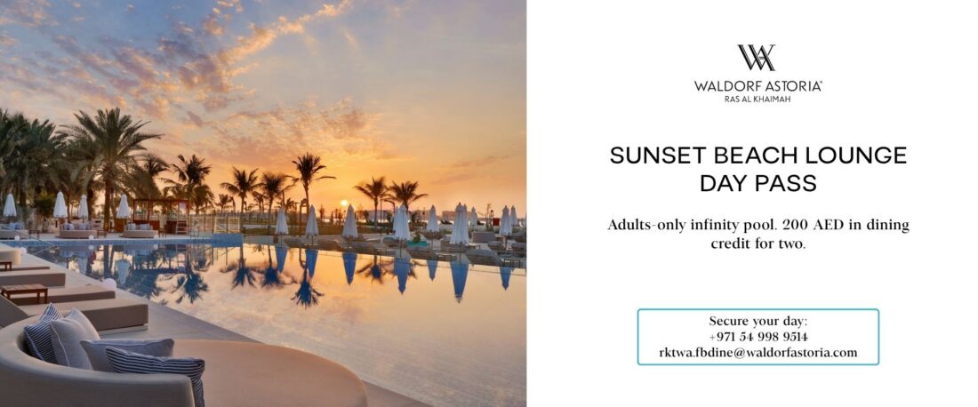 An adults-only, temperature-controlled infinity pool, the warmth of the Arabian Gulf at eye level, and 200 AED in combined dining credit for two. Our Sunset Beach Lounge day pass costs 200 AED and earns its keep.