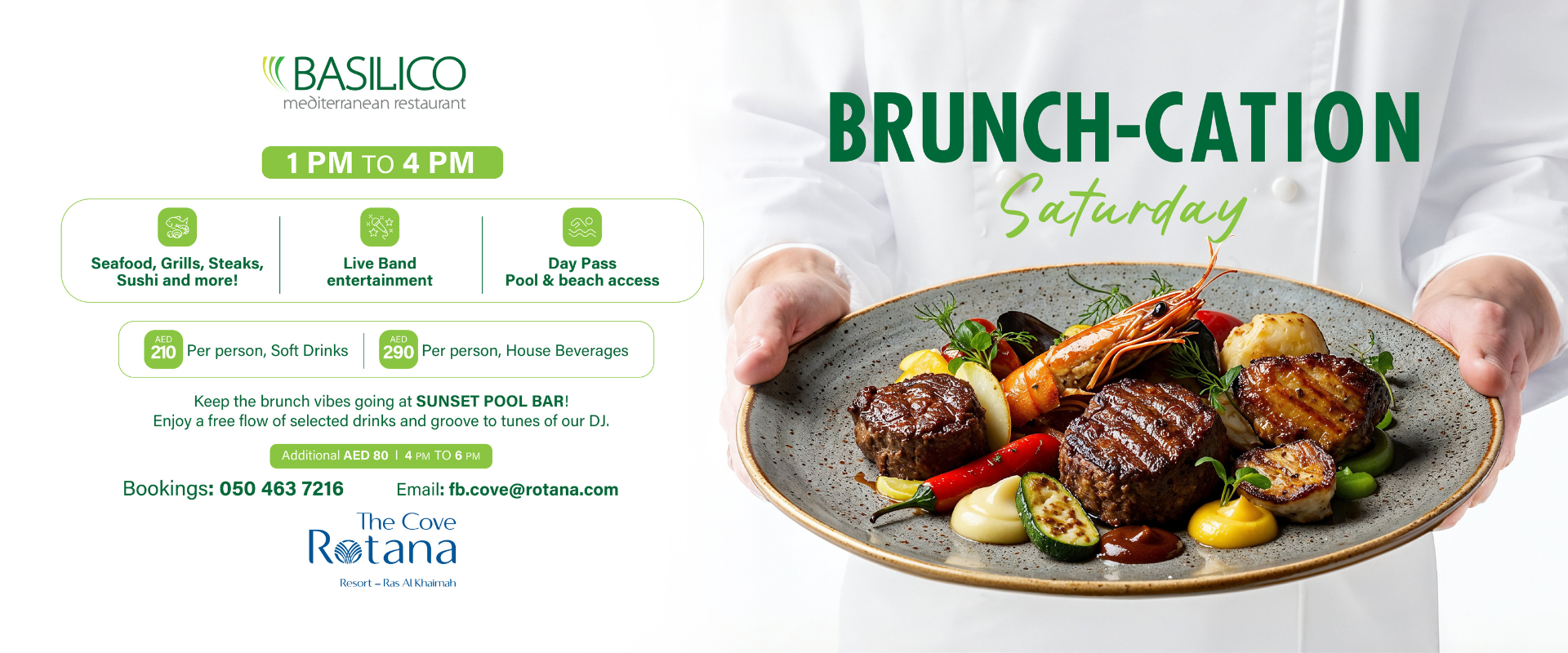 Basilico Restaurant The Cove Rotana ResortJoin us every Sunday for a special lunch and delight in our exquisitely prepared Roasts featuring Roasted Angus Striploin, Braised Lamb Leg, Corn Fed Yellow Chicken and more! AED 99 per person inclusive of dessert Every Sunday 12:00 noon to 6:00 pm